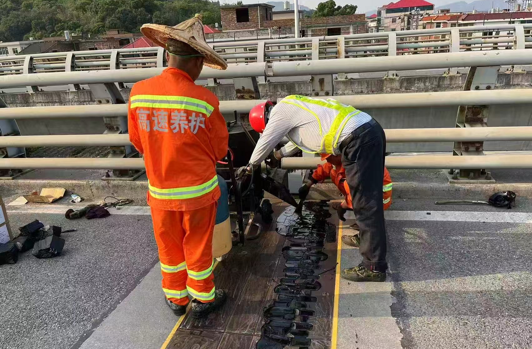 施工过程中,养护人员严格按照工艺规程操作:首先对原有梳齿型伸缩缝缝槽进行彻底清理、打磨、除锈和烘干,确保基面洁净牢固;随后灌注双组分改性聚合物密封胶。整个过程注重细节把控,确保新旧材料结合紧密、表面平整顺直。