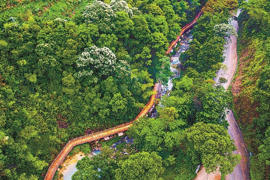 沿双芦溪新建的3.2公里亲水栈道漫步,溪水清澈,风光如画。摄影爱好者迅速支起三脚架,捕捉白鹇掠过水面的瞬间。
