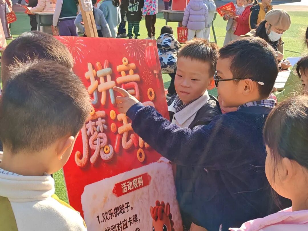 最考验语言表达的 “造句迎福气”环节,成了孩子们展现语言天赋的舞台。现场摆放着趣味转盘,孩子们转动转盘获取造句题卡,根据提示发挥想象造句。数学闯关 “分类小掌柜”趣味十足,孩子们通过抽签领取题卡,迎接气球、扣子、图形卡片的分类挑战。“小小测量师”更是对孩子们测量知识的大考验。抽签领题后,孩子们在 “测量千里马”环节辨别“厘米” 与 “米”的单位应用,在 “金马量新春”关卡实操测量物品长度,在“小马量量乐” 中判断斑马线间隔的单位。