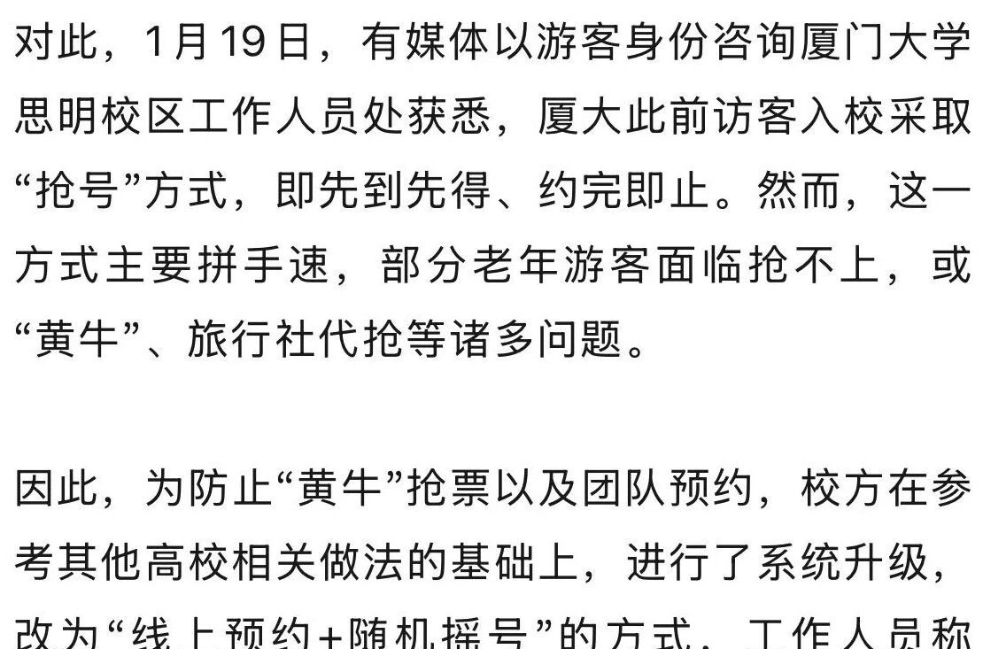 据媒体报道,1月20日起,厦门大学主校区访客入校将采用“线上预约+随机摇号”制。学校提前3天开放预约号段,按具体参观时间分批次放号、摇号,摇中即获取入校资格。
