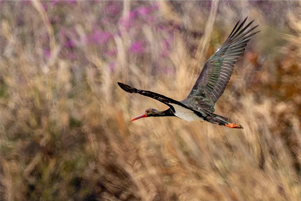 ▲黑鹳飞行时黑白羽色对比鲜明,姿态优雅独特,极具辨识度。卢国成/摄