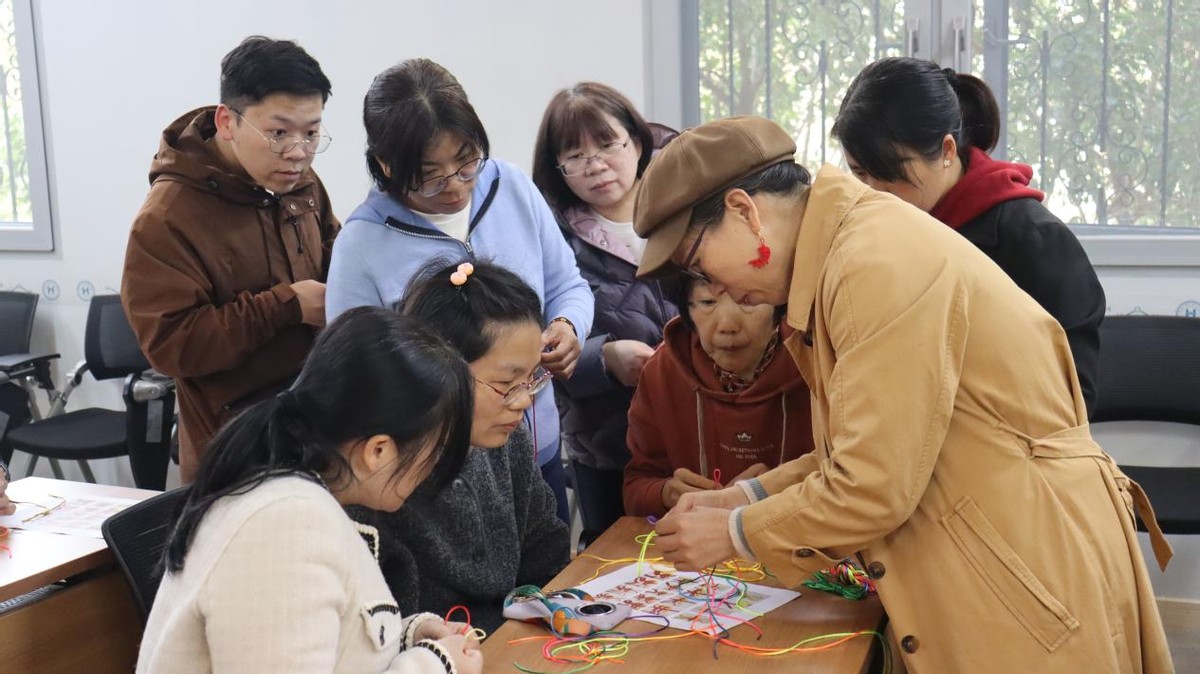 活动中,师生以传统蛇结为基础技法,通过不同组合勾勒出小篆“马”字的轮廓。彩线交错、渐渐成形,一个个寓意吉祥的“马”字结在指尖诞生。同学们在协作与分享中,深化了对汉字美学与手工技艺的双重理解。