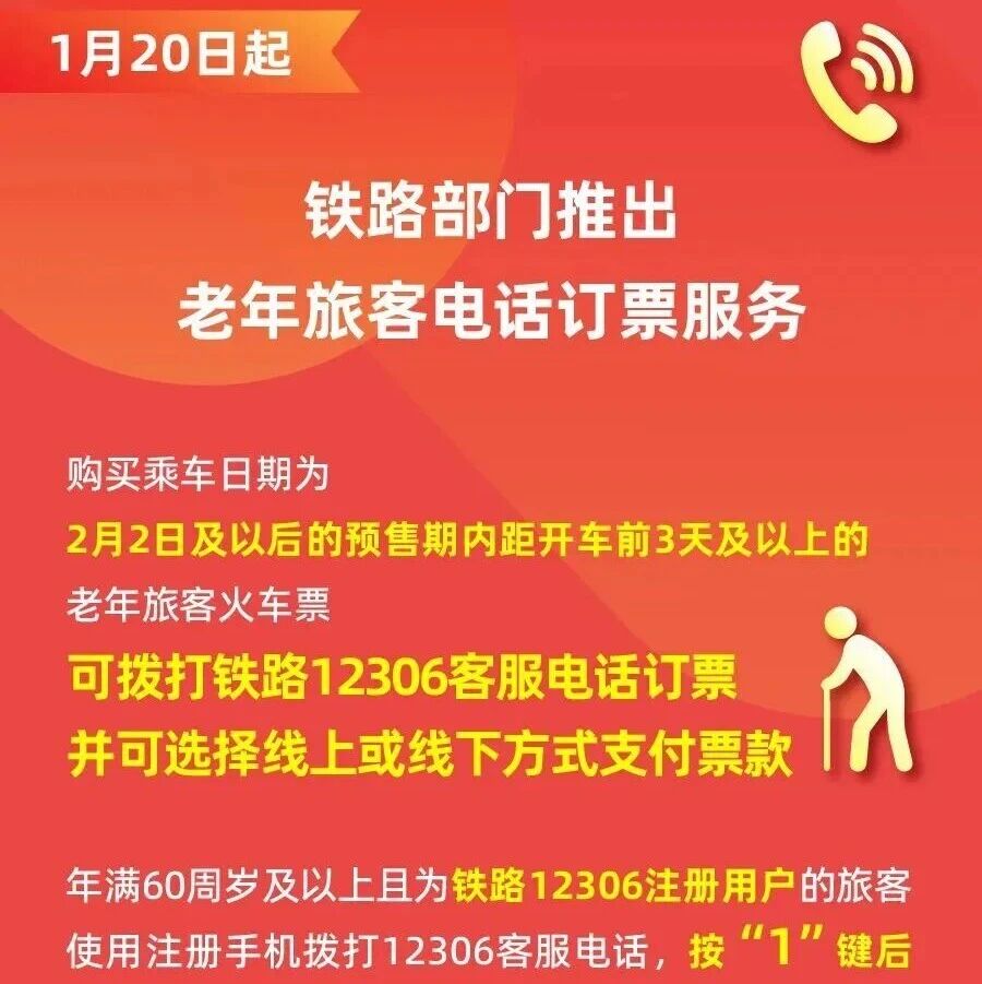 记者从中国国家铁路集团有限公司(以下简称“国铁集团”)获悉,1月20日起,在既有订票渠道基础上,铁路部门推出老年旅客电话订票服务,购买乘车日期为2月2日及以后的预售期内距开车前3天及以上的老年旅客火车票,可拨打铁路12306客服电话订票,并可选择线上或线下方式支付票款,将进一步方便老年旅客购票出行。