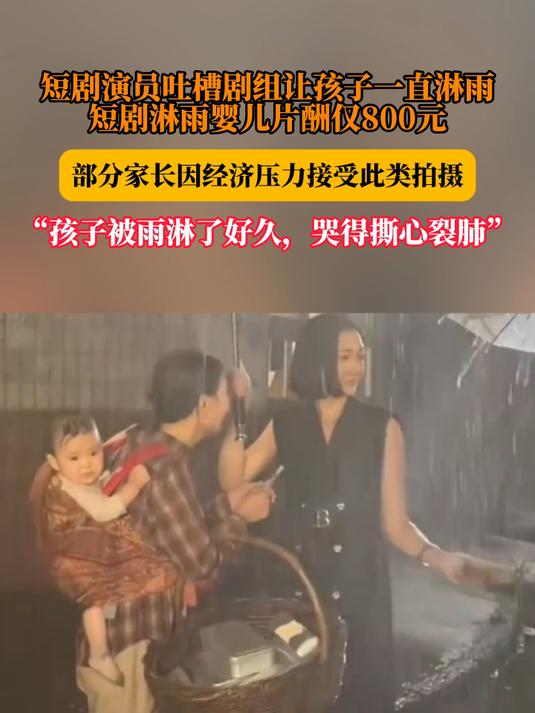 近日,有短剧演员爆料,某剧组拍夜场雨戏时,为了省时间不换假婴儿,硬是让小宝宝淋着洒水车的瓢泼大雨,孩子哭得撕心裂肺,全程没停过。更离谱的是,淋雨婴儿的片酬仅800元!不少家长因为经济压力,只能被迫接受这种不合理的拍摄要求。