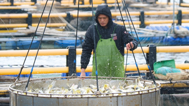 “2025年,我一共养了2个网箱共90万尾鱼苗,成活了60多万尾,这几天正忙着全部出售。”西澳村养殖户陈香弟一边麻利地协助转运渔获,一边笑着分享丰收的喜悦。他说,卖完这批鱼后,等清明节左右就重新进苗,养到11月份左右,大黄鱼长到4两重时再销售上市。