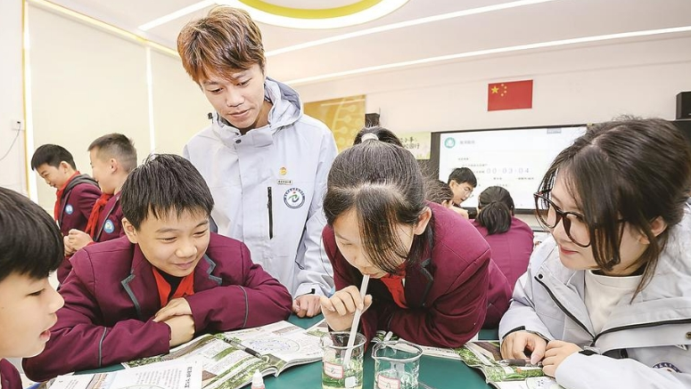 1月20日,福建师范大学东侨实验小学内,来自福建师范大学协和学院的大学生寒假社会实践队队员加入小学生的课堂,共同体验由宁德时代开发的“零碳”特色校本课程。