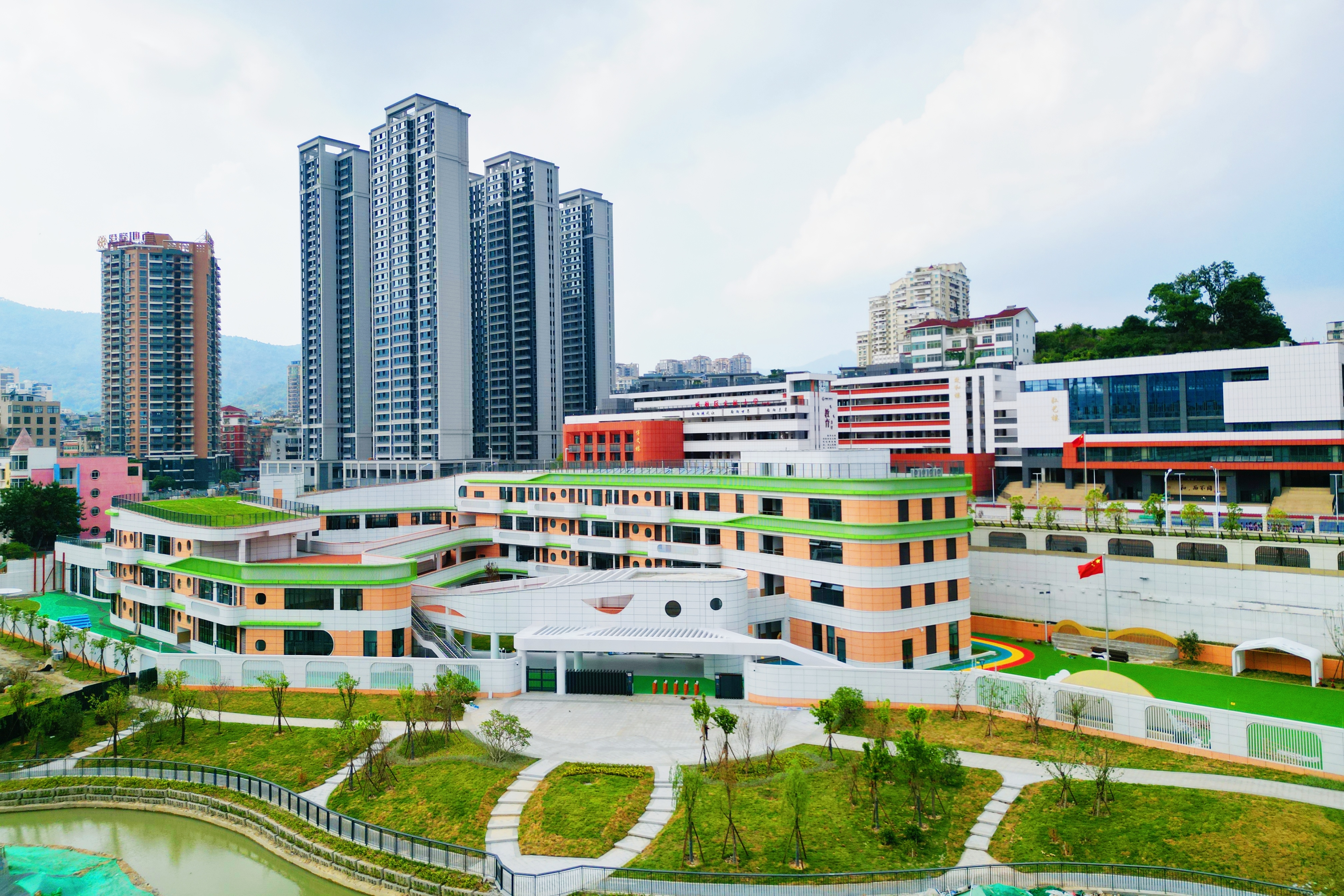 据了解,莆田市儿童乐园新校区设计深度融合“山水建筑”理念,与相邻的下磨溪公园自然景观有机融合。通过层层退台形成叠落有致的空间形态,实现室内外环境的自然贯通。屋顶花园、活动连廊、儿童游乐区等多样化活动场所,共同构建出“山水呼应、内外融合”的育人环境,为幼儿打造一个可探索、可游戏、可学习的沉浸式成长空间。
