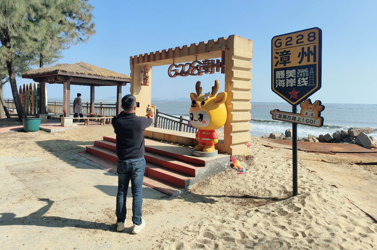 浮头湾沙滩上的“G228漳州最美海岸线”标识牌旁,公路IP“路宝”的小鹿雕塑正迎着海浪微笑,游客们举着同款玩偶合影,快门声混着涛声,成了最生动的背景音。“这片林是活的历史啊,踩着落叶走,像在和六十年前的治沙人对话。”当日,来自漳州市区的游客刘先生蹲在树旁,指尖抚过粗糙的树皮,眼里浸着温柔。