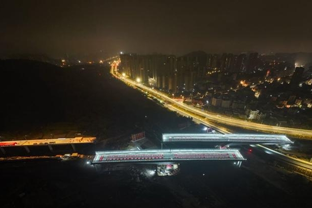 当日凌晨2时19分,转体施工正式启动。重达14500吨的巨型T构梁体,在两台350吨级千斤顶同步牵引下,以桥墩为中心平稳旋转。经过119分钟作业,左幅7号墩逆时针旋转56度、右幅4号墩逆时针旋转52度,梁体精准跨越杭深铁路并顺利就位,于4时18分实现对接,施工圆满完成。