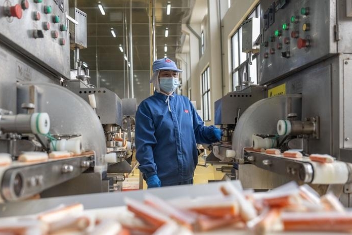 这几日,在胜田食品的蟹柳生产线上,自动化机器有序运转,鱼糜搅拌、压延成型、蒸汽蒸煮、卷切分装等工序一气呵成,全程实现自动化、标准化操作。