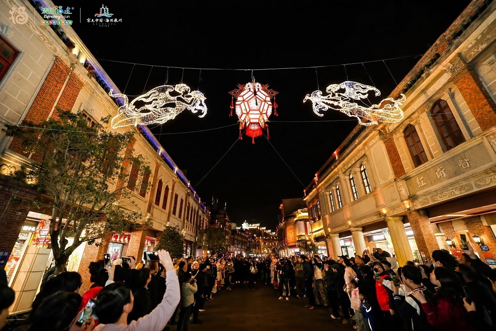 闽南网1月29日讯(闽南网记者 陈玉玲)28日晚,“千灯映古城” 活动在泉州古城启幕,中山中路 “妙音飞天” 立体灯组惊艳亮灯,通政巷“上新”特色刺桐花灯,《刺桐宋潮·海丝迎春》幻幕演出同步精彩亮相。灯火亮起,厝里看花,泉州马年春节的年味在光影交错中愈发醇厚绵长。