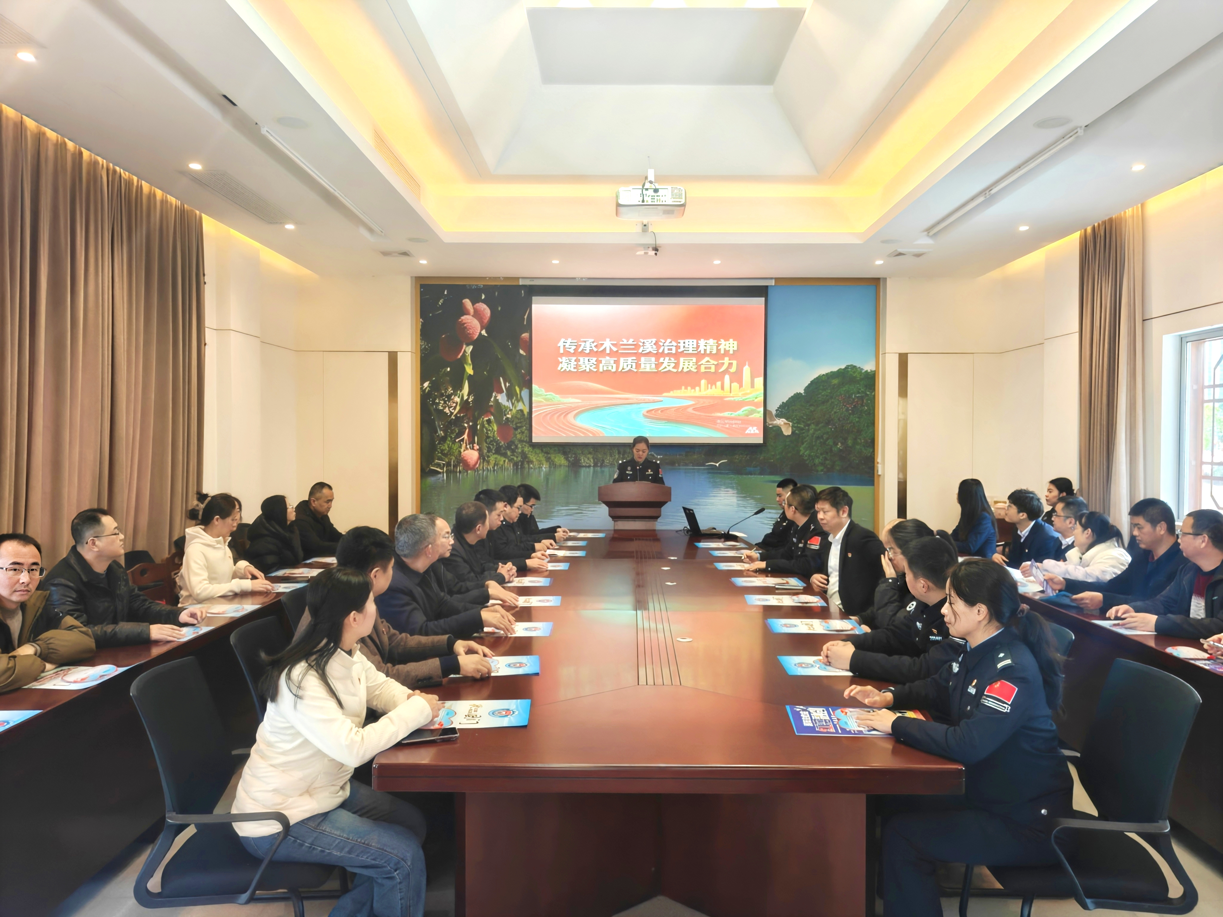 活动以实地研学与情景党课相结合,突出党建引领下的业务协同。在木兰溪治理展示馆的沉浸式导览中,40多名党员重温了木兰溪从“水患之河”到“幸福河湖”的治理历程,深刻感悟“变害为利、造福人民”的治理理念。
