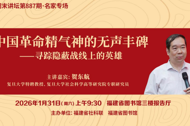 随着电视剧《沉默的荣耀》热播,以吴石将军为代表的一批隐蔽战线英雄走进了广大观众的视野,他们为家国大义作出的牺牲感人至深。1月31日(周六)上午9:30,复旦大学特聘教授、社会科学高等研究院专职研究员贺东航将做客福建省图书馆“东南周末讲坛·名家专场”,他将以“中国革命精气神的无声丰碑——寻踪隐蔽战线上的英雄”为题,带领读者一同回望那段沉默的历史,聆听隐蔽战线上的英雄事迹,瞻仰信仰铸就的精神丰碑。