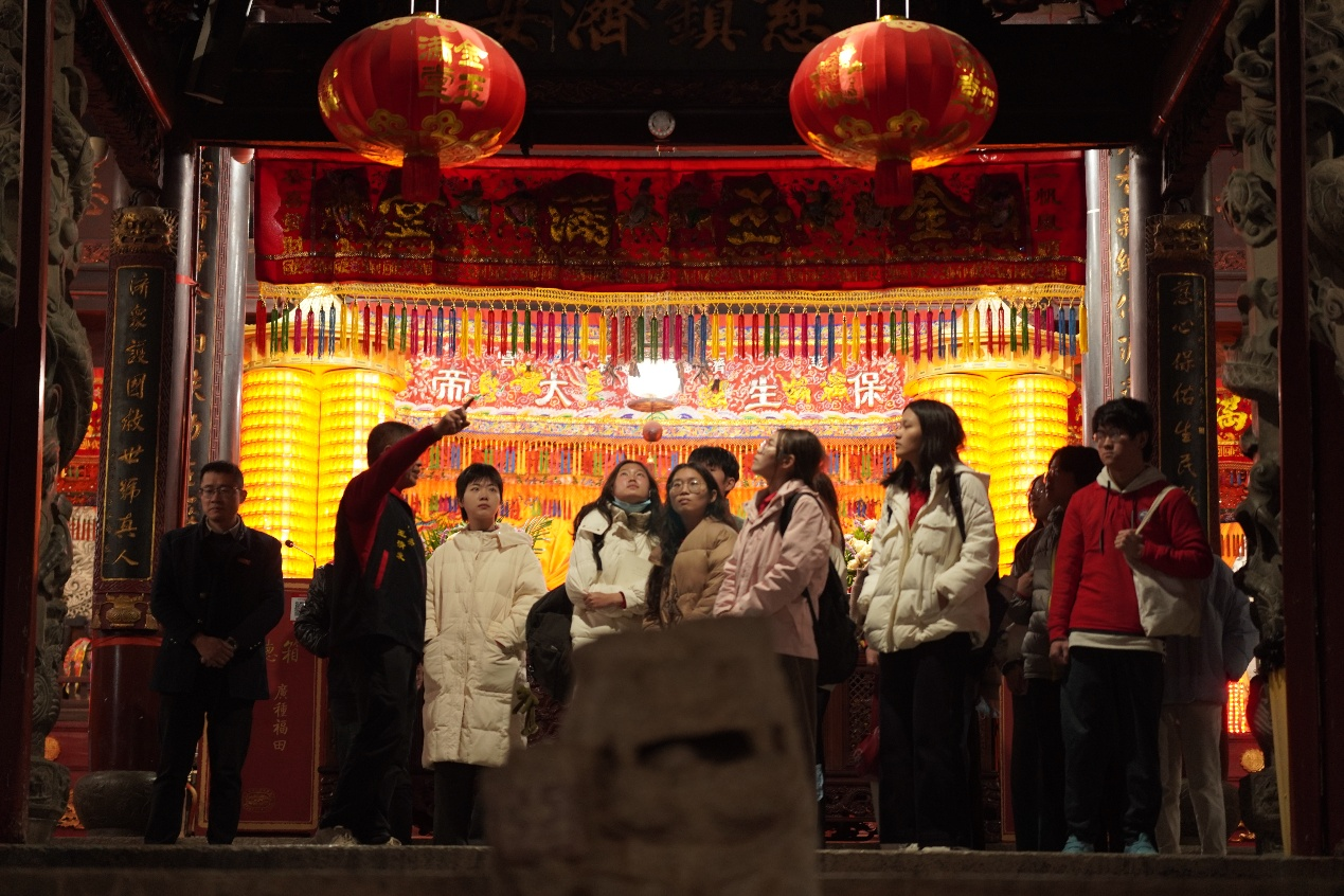 调研团受到白礁慈济祖宫管委会的热情接待。在总务王清发先生细致讲解下,详细了解了祖宫的建筑格局。在祖宫内外,众多珍贵文物与艺术作品让两岸青年驻足赞叹。宋代石雕、明代国母狮、清代台湾后裔捐赠的蟠龙石柱等文物,以及精美木雕、彩绘、两岸匾额,共同诉说着祖宫深厚的文化底蕴,也是闽台文化同根同源、交往交流交融的鲜活佐证。师生聆听保生大帝吴夲行医济世、孝亲爱民的事迹,感悟其蕴含的仁爱、向善、奉献与精进的道医精神内核,深化对传统医德与文化传承的认知。