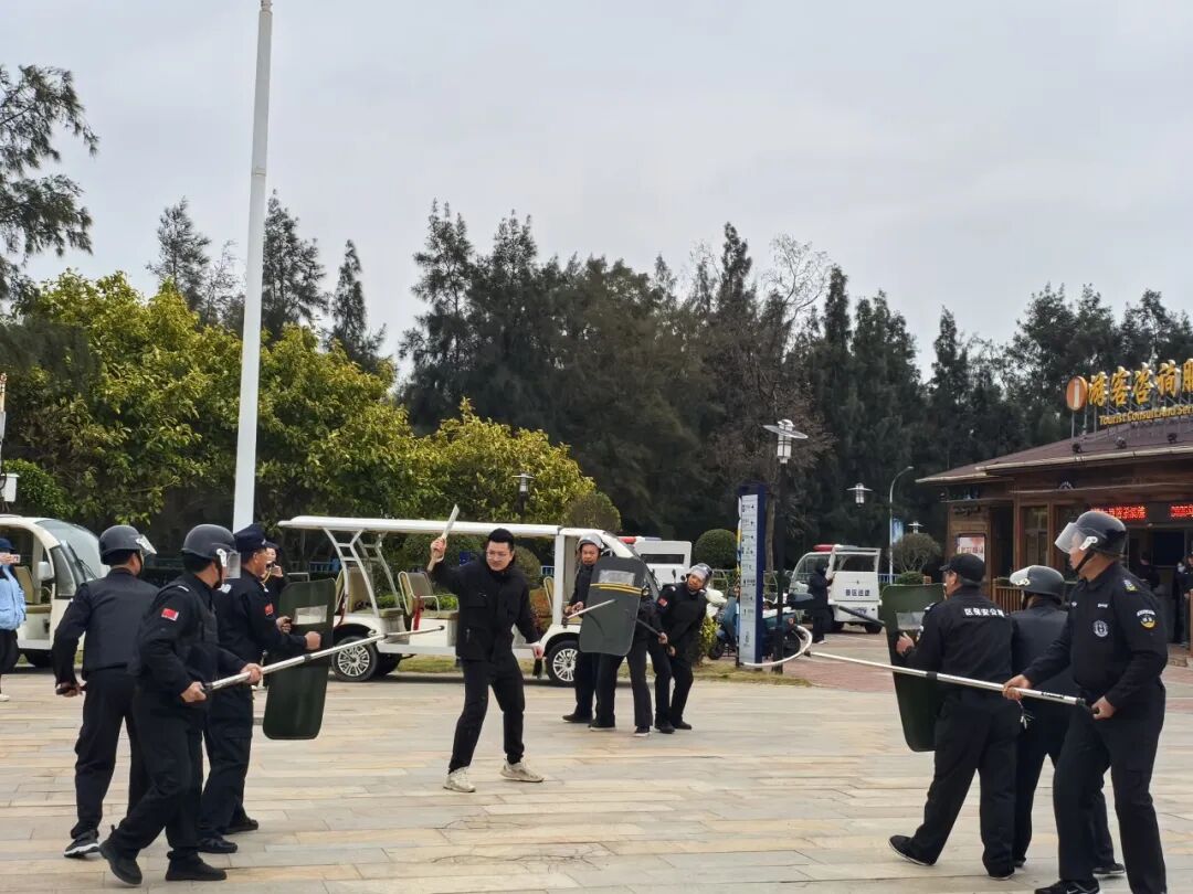 我司联合金井片区局、公安局金井支队在南部湾旅游度假区开展防恐防暴演练,本次演练以“警景联动、快速处置”为核心,景区安保团队与金井支队民警协同作战,模拟“暴恐分子持械闯入景区入口,捅伤游客”的突发场景。演练伊始,景区保安人员迅速集结,报警并持防暴盾牌、钢叉、警棍等装备形成防御阵型,与“暴恐分子”巧妙周旋,有效遏制其行动范围,为警方支援争取宝贵时间;与此同时,游客服务中心带班人员携医务人员及急救设备赶赴现场,迅速转移并救治伤者。