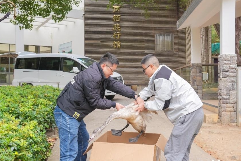 去接“梦翔”回家的那天,林少伟一直追着饲养员问,怎么喂食、有哪些注意事项。动物园的天鹅湖边,兽医江明斌仔细叮嘱:“它飞不了了,但好好养着,也能活得好好的。”