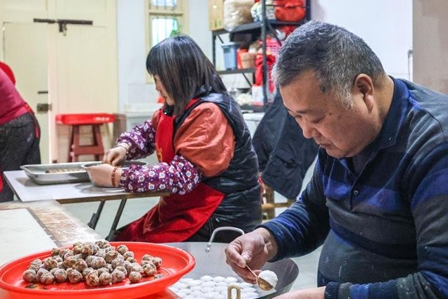 连江东水村村民在制作鳗鱼丸。