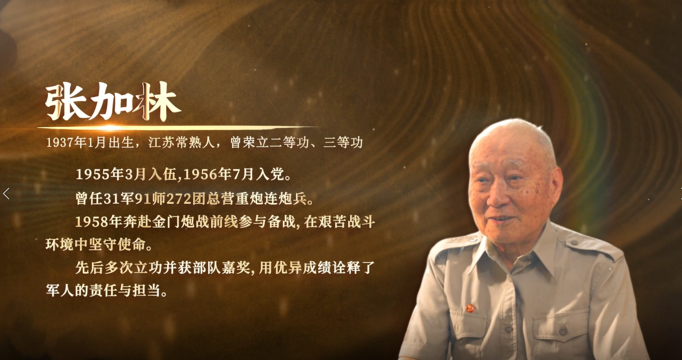 张加林,福州市铜盘军休所军休干部,江苏常熟人,1937年1月出生,1955年3月入伍,原31军91师272团总营重炮连炮兵,曾荣立二等功、三等功,1958年奔赴金门炮战前线参与备战,在艰苦战斗环境中坚守使命,先后多次立功并获部队嘉奖,用优异成绩诠释了军人的责任与担当。