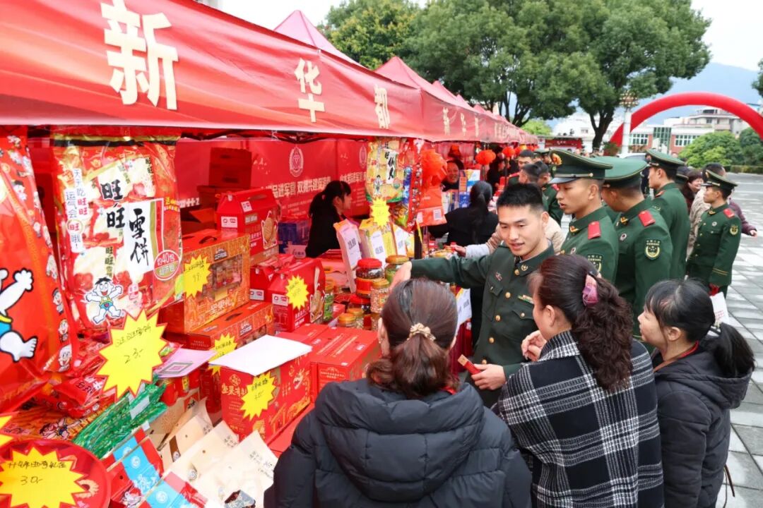 1月31日,龙岩市民兵训练营广场热闹非凡,由龙岩市退役军人事务局、市商务局、龙岩军分区政治工作处联合主办的"山水岩品进军营 双拥共建促消费"活动在此举行。20余家本土老字号特色品牌和知名运动品牌企业带着千余款特色产品走进军营,6位书法家现场挥毫为官兵及军属免费书写春联、福字。此外,龙岩市政府配套的消费券更是为活动增添了浓厚的年味和实惠。活动以实打实的优惠、一站式的贴心服务,为官兵及军属送上浓浓暖意。