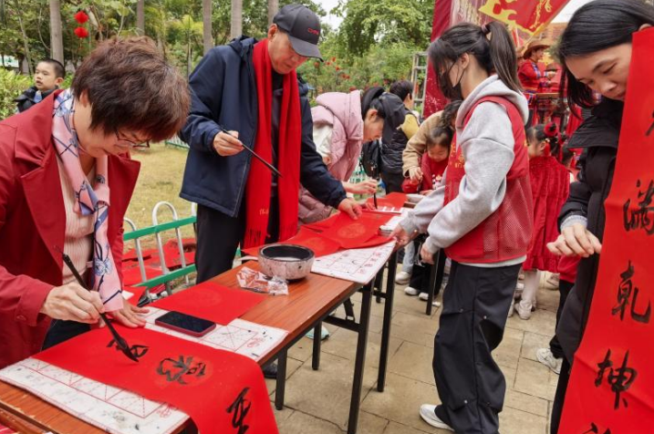 迎春市集的便民服务区暖意涌动,爱心业主与共建单位组成的志愿服务队忙而有序。书法爱好者挥毫泼墨,将吉祥春联和“福”字送到业主手中;医护人员提供血压检测、健康咨询;爱心业主提供免费美甲服务;现场还有长富牛奶、特色点心等免费赠吃。活动依托“业主点单、支部下单、志愿接单”模式,精准对接需求,赢得业主一致好评。
