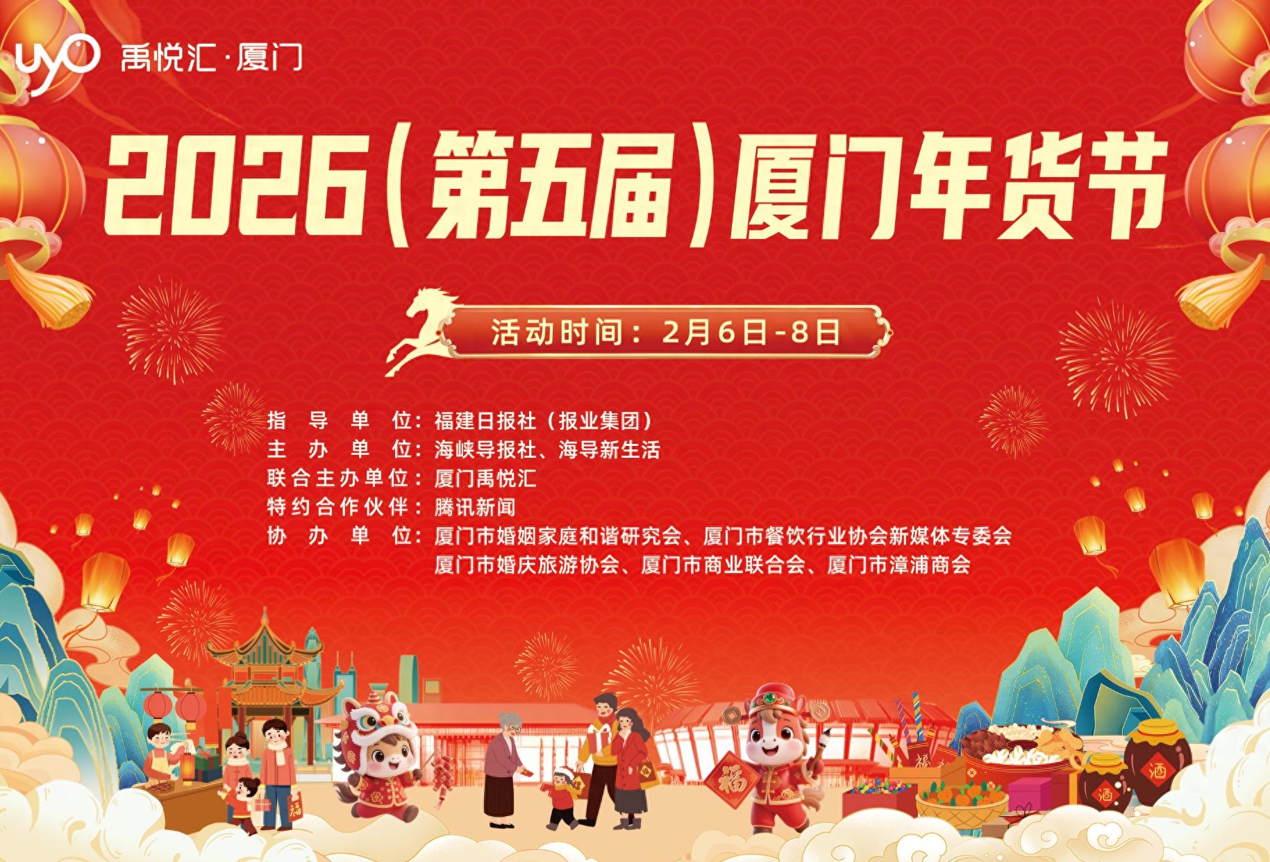 本次年货节由福建日报社(报业集团)指导,海峡导报社、海导新生活和厦门禹悦汇联合主办,特约合作伙伴腾讯新闻,厦门市婚姻家庭和谐研究会、厦门市餐饮行业协会新媒体专委会、厦门市婚庆旅游协会、厦门市商业联合会、厦门市漳浦商会协办。
