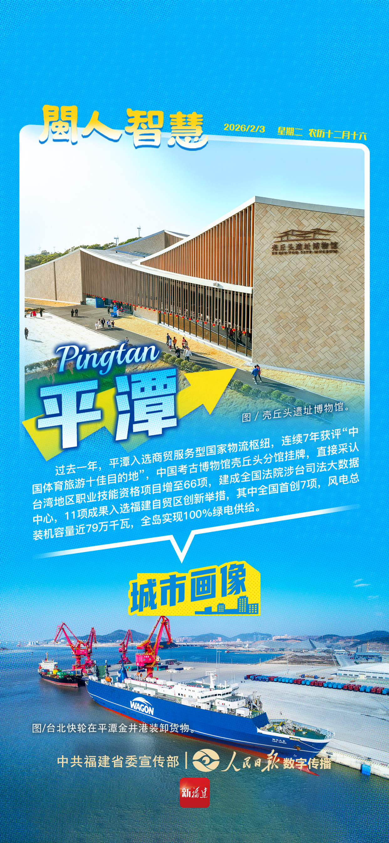 平潭:过去一年,平潭入选商贸服务型国家物流枢纽,连续7年获评“中国体育旅游十佳目的地”,中国考古博物馆壳丘头分馆挂牌,直接采认台湾地区职业技能资格项目增至66项,建成全国法院涉台司法大数据中心,11项成果入选福建自贸区创新举措,其中全国首创7项,风电总装机容量近79万千瓦,全岛实现100%绿电供给。