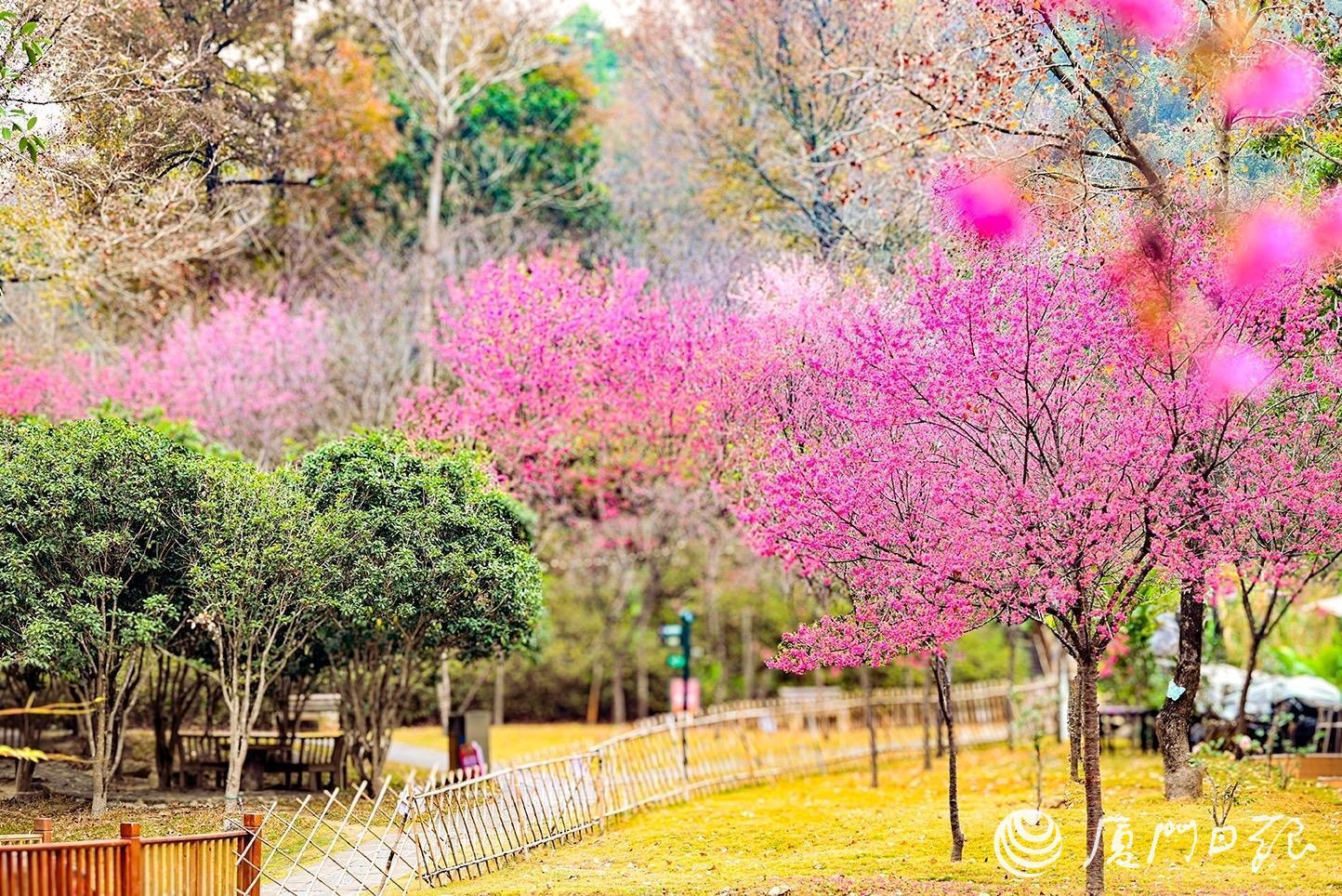 “相比往年,今年樱花花期提早了约两周。”天竺山森林公园相关负责人介绍,四季花谷的樱花多为福建山樱和吉野樱,吉野樱呈粉白色,福建山樱呈玫红色。两种樱花沿着峡谷步行道两侧有序生长,形成“漫山粉雪”的景象。