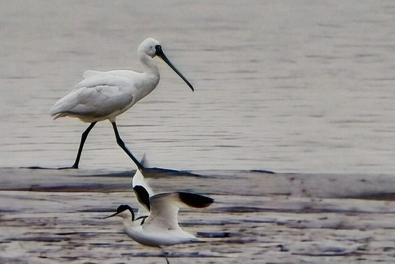 黑脸琵鹭现身福清龙江猪母湾湿地公园。