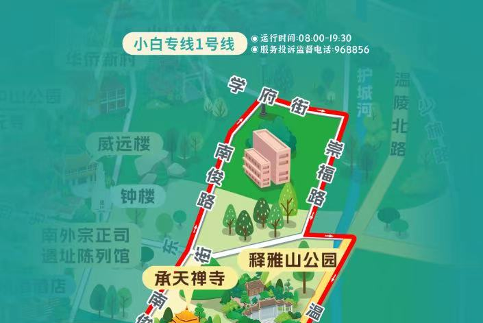 “小白”专线1号线线路走向:文化宫—南俊路—学府路—崇福路—东街—温陵路—涂门街—百源路—文化宫(单向开行)。运营时间为8:00—19:30,平均6—7分钟一班,一票制2元/人。