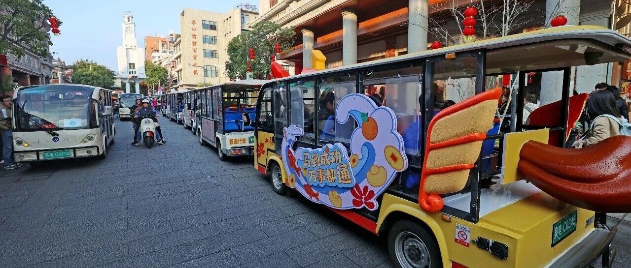 主题观光车色彩明快、设计精巧,为古城街头带来别样的新春韵味。