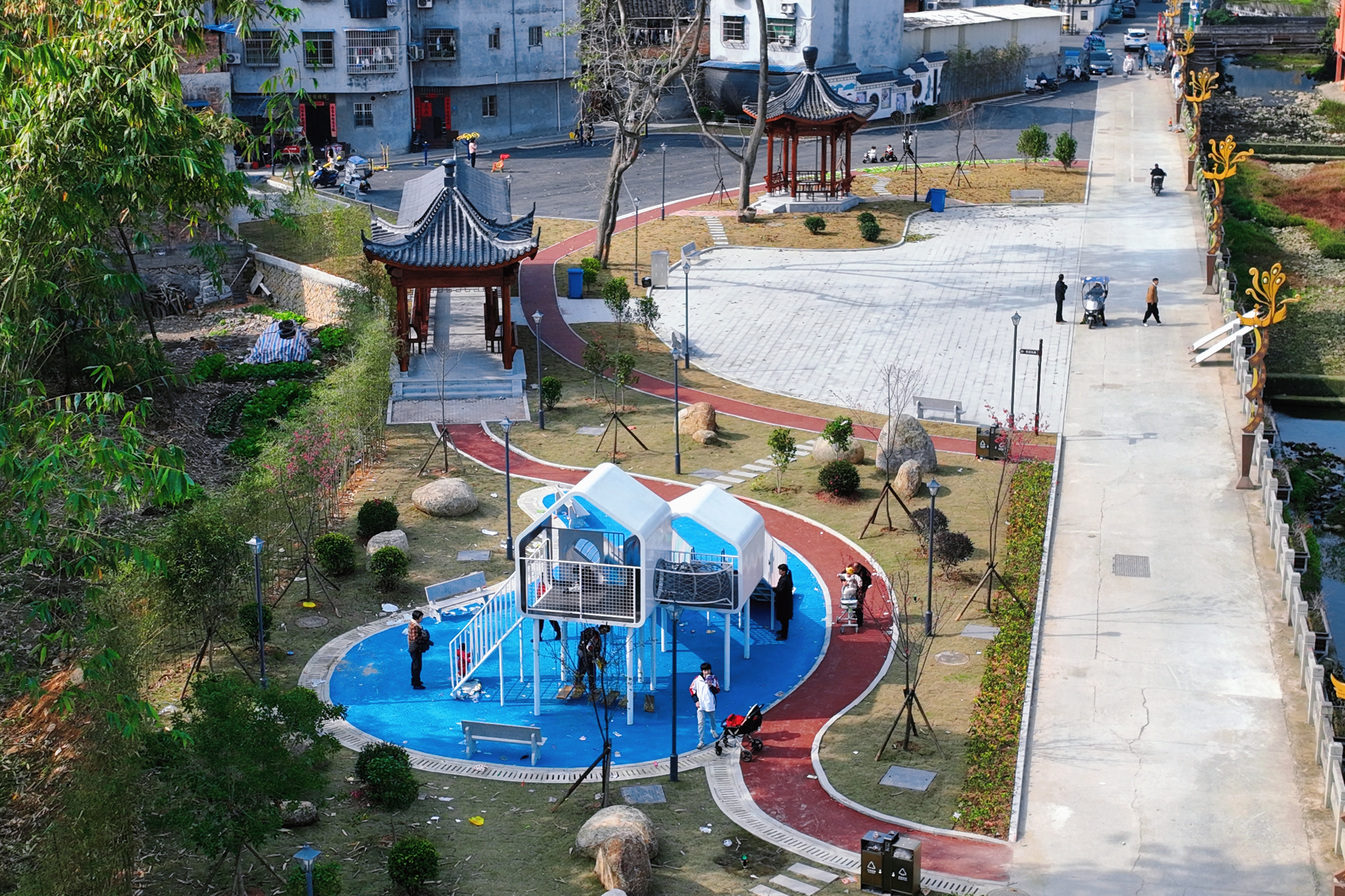 公园依杨梅溪而建,顺势造景打造亲水环境,集休闲、健身、娱乐功能于一体,沥青步道、景观绿化、游乐器材、石桌坐凳等设施一应俱全,将昔日闲置空间打造成家门口的“幸福乐园”。