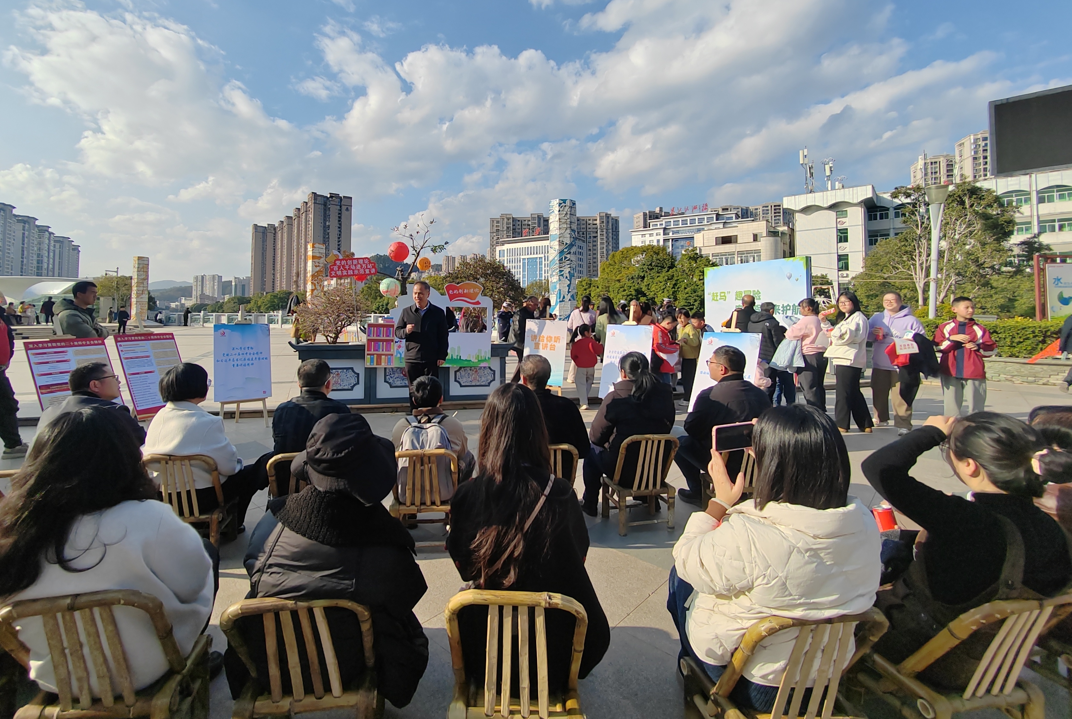活动现场氛围热烈,主舞台表演精彩纷呈,为市民带来了一场兼具观赏性与教育意义的文化盛宴。暖场视频《主播说新风》以鲜活生动的形式开篇,迅速拉近了与观众的距离;歌曲《白凤凰之歌》《是你一直想着我》《不忘初心》用悠扬旋律传递正能量;快板表演《竹板声声话反诈远离赌博护万家》节奏明快、朗朗上口,将拒赌反诈知识融入清脆竹板声中,通俗易懂。