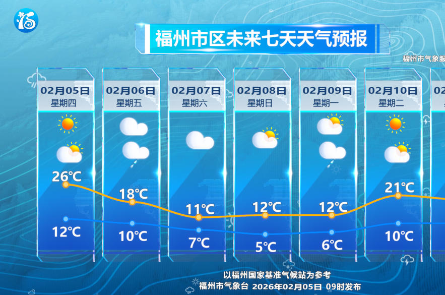 5日福州市区最高气温在26℃左右
