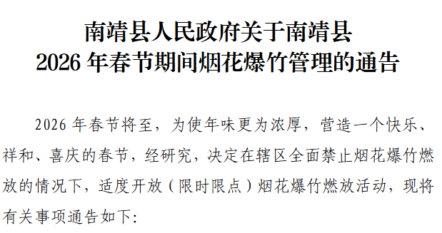 日前,南靖县政府发布了《2026年春节期间烟花爆竹管理通告》,和往年的“禁炮令”不同的是,此次通告说:“为使年味更为浓厚,营造一个快乐、祥和、喜庆的春节,经研究,决定在辖区全面禁止烟花爆竹燃放的情况下,适度开放(限时限点)烟花爆竹燃放活动。”这个通告一经发布,马上引起当地许多群众的热议,纷纷点赞。