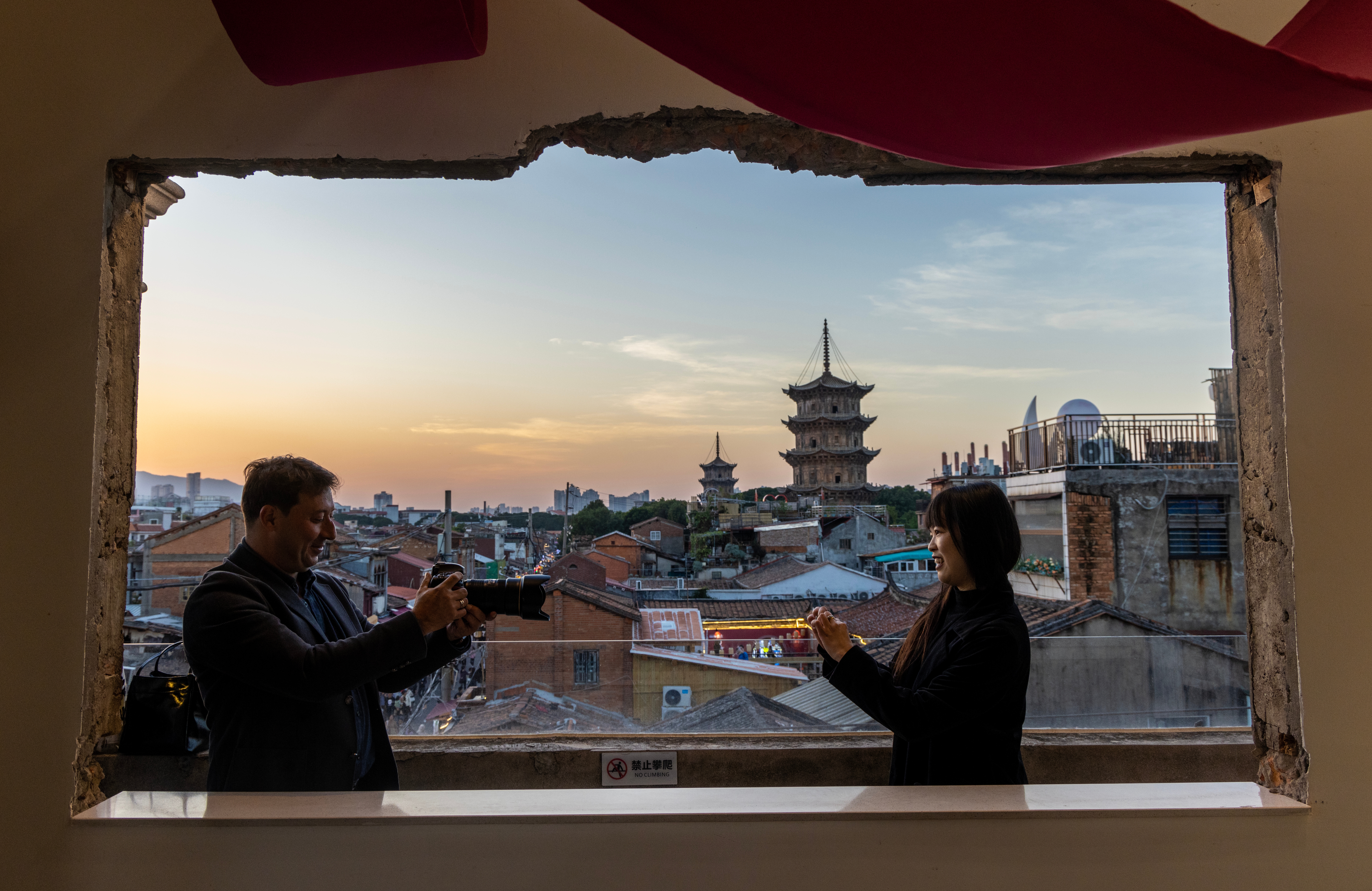 2024年12月1日,泉州西街东西塔附近,意大利摄影师艾罗斯在给他的中国妻子林园园拍摄。