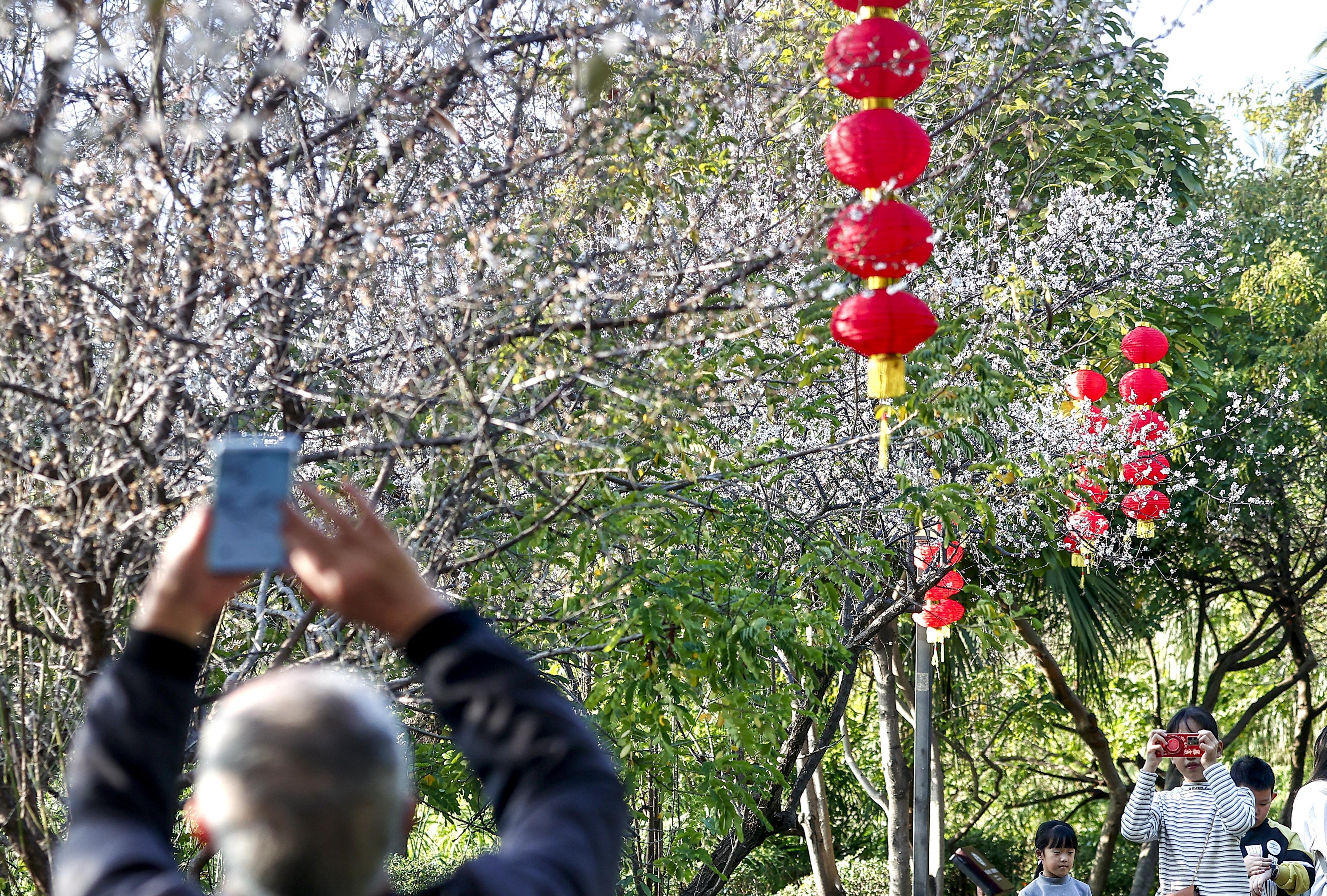 东湖公园白梅盛开,引来蜂飞蝶舞。(林劲峰 摄)