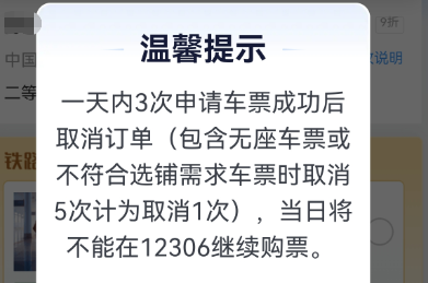 按照12306平台目前执行的相关规定,一天内3次申请车票成功后取消订单(包含无座车票或不符合选铺需求车票时取消5次计为取消1次),该账户当日的购票权限就将被暂时锁定,到次日零时将自动恢复。