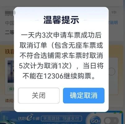 铁路部门相关人士表示,12306平台的这一要求目的是规范购票秩序,限制恶意囤票、刷票的行为,这并非今年的新政策,已实行多年。同时,其限制的不是相关乘车人的购票权限,而是“当日取消了三次订单”相关账户的当天购票权限,也就是说,该乘车人仍可以正常购票乘车。