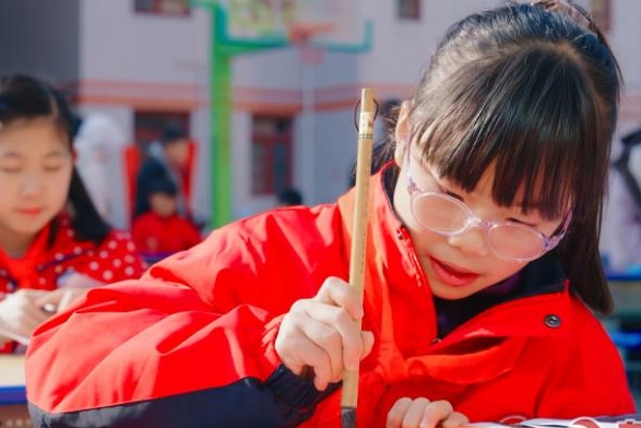 “平安如意福星照,富贵吉祥好运来”“马年如意行好运,春日祥和享安康”……孩子们灵动的笔触在红纸上流转,一幅幅寓意吉祥的春联渐次成型,一张张红底黑字的“福”字跃然纸上,墨香与年味交织在一起。