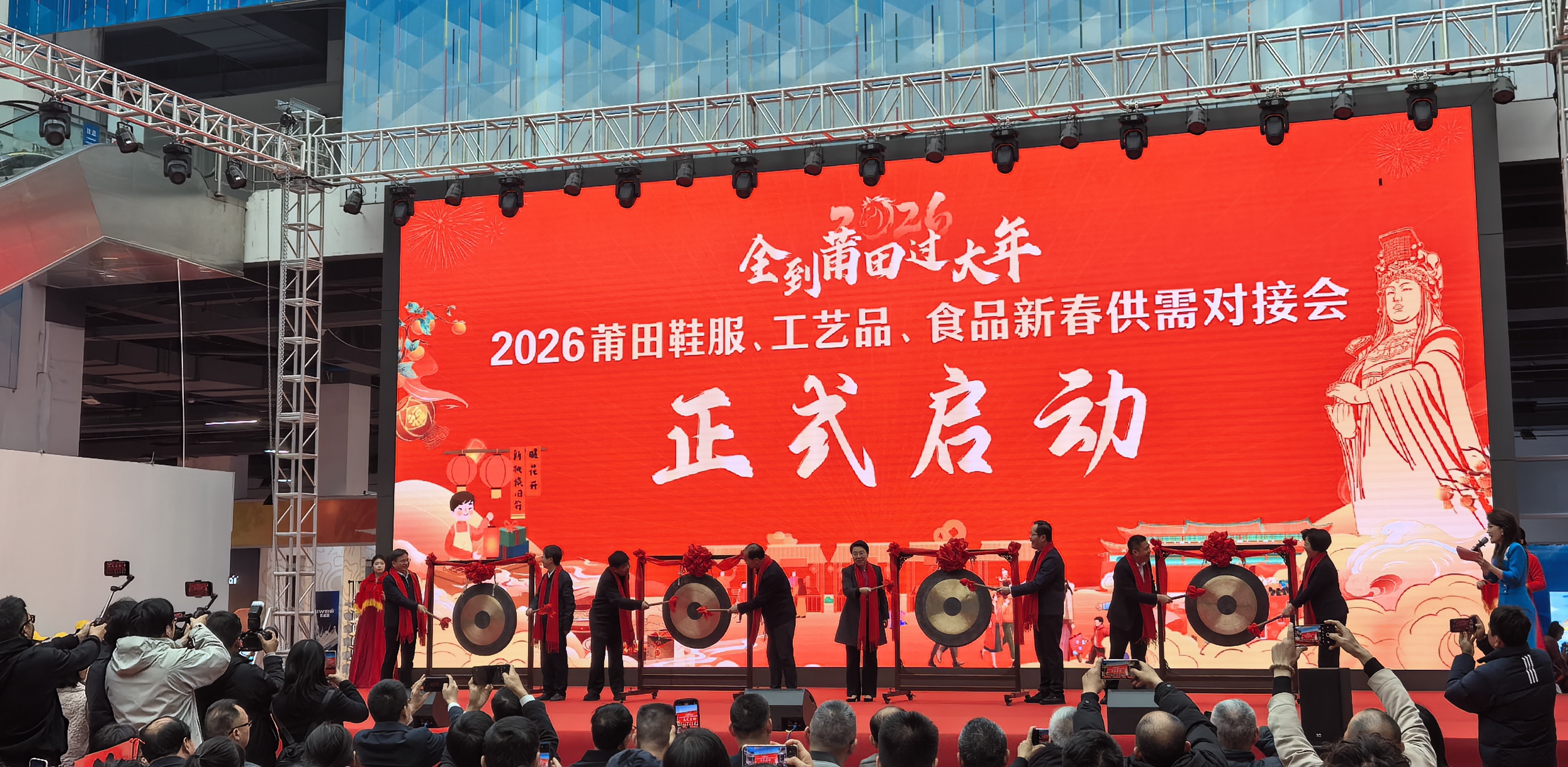 随后,与会领导共同为启动仪式击响铜锣,以“鸣锣开市”这一传统仪式,宣告本次新春供需对接会活动正式启动。下一步,系列活动将持续开展,通过展览推介、洽谈对接、线上促销等多种形式,助力莆田鞋服、工艺品和食品企业开拓渠道、打响品牌,也为广大市民和消费者提供丰富优质的新春消费选择。