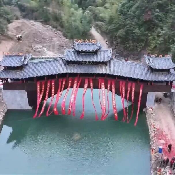 据悉,其原址木拱廊桥于上世纪六十年代末拆建为石拱桥。此次新址建造的廊桥总耗资480多万元,桥体长38米、宽6米,五亭翘角的独特设计精准呼应“福、禄、寿、喜、财”五福意象,寄托着百姓对美好生活的向往,为村民提供休闲交流公共空间。