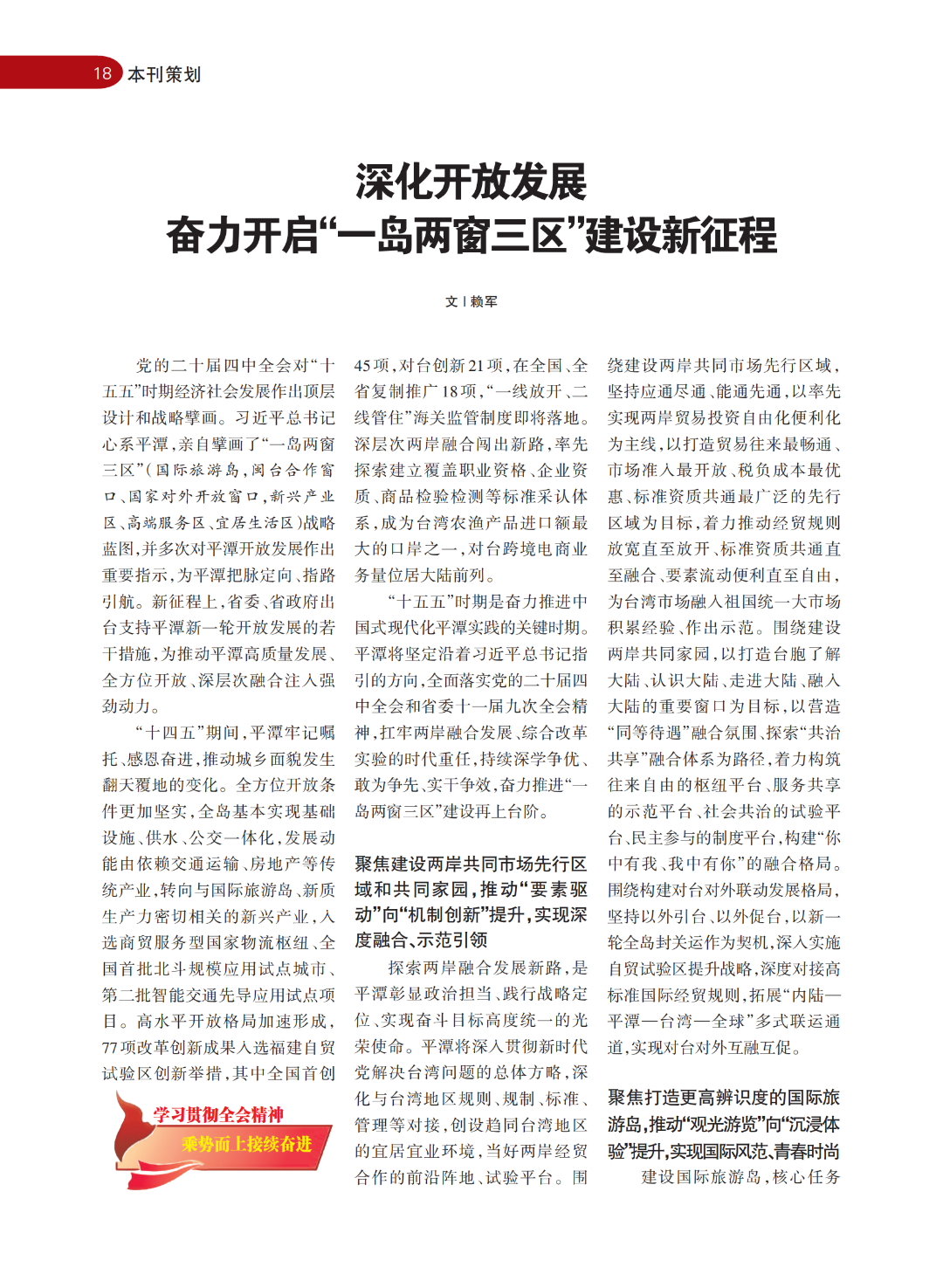 党的二十届四中全会对“十五五”时期经济社会发展作出顶层设计和战略擘画。习近平总书记心系平潭,亲自擘画了“一岛两窗三区”(国际旅游岛,闽台合作窗口、国家对外开放窗口,新兴产业区、高端服务区、宜居生活区)战略蓝图,并多次对平潭开放发展作出重要指示,为平潭把脉定向、指路引航。新征程上,省委、省政府出台支持平潭新一轮开放发展的若干措施,为推动平潭高质量发展、全方位开放、深层次融合注入强劲动力。