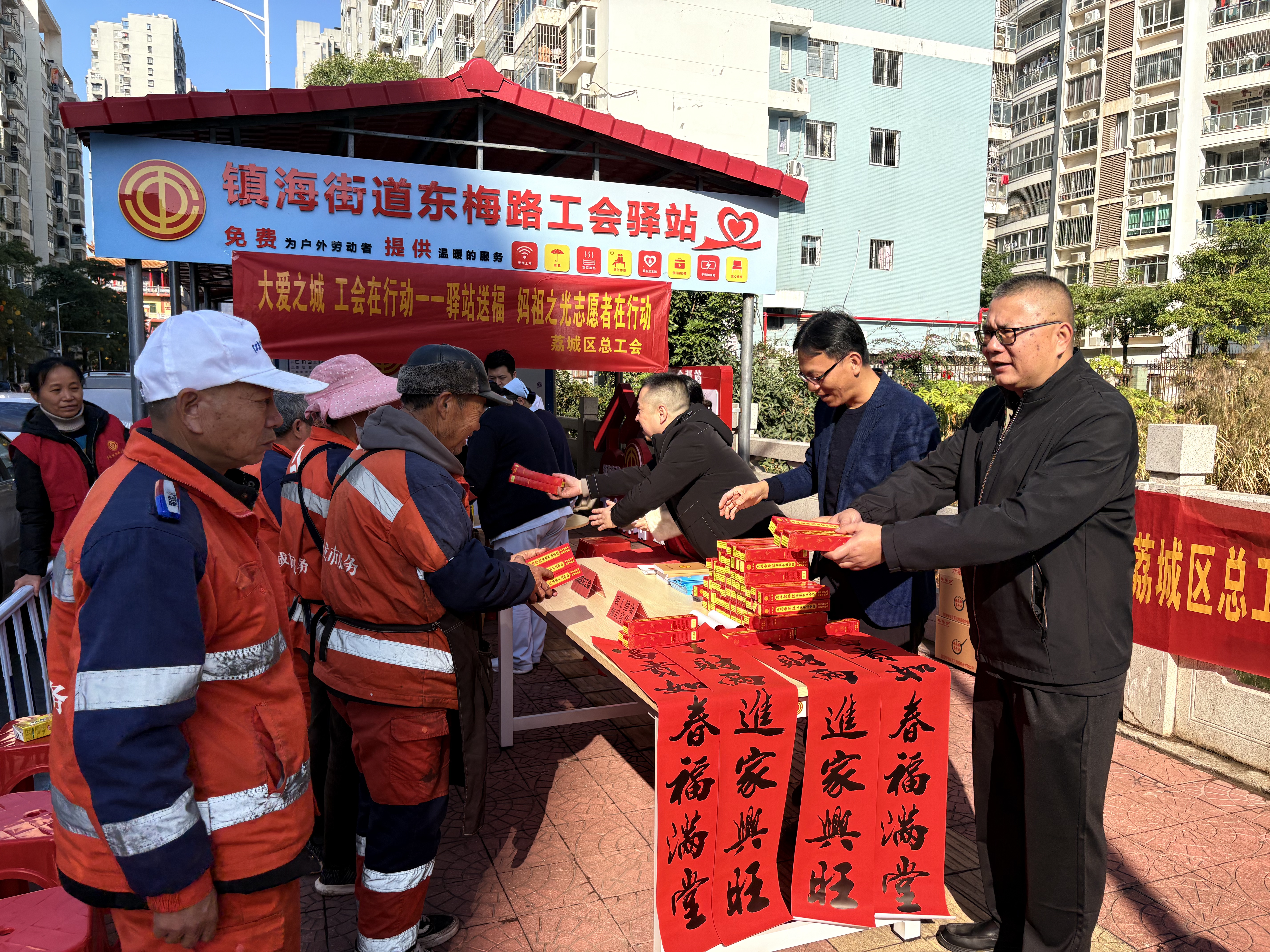 活动采用“基础服务+特色体验”双轨模式,让职工既能享受普惠关怀,也能感受特色温情。各驿站同步开展基础服务,工作人员与妈祖之光志愿者分工协作,为一线职工发放慰问品,传递新春祝福;邀请医疗机构开展健康知识讲座和义诊服务,守护职工身心健康;联合志愿服务团队、社工组织开展写春联赠春联活动,以笔墨传情,送上新春美好祝愿,部分驿站还增设免费理发、安全宣传、宪法宣传等便民举措,切实解决职工急难愁盼。