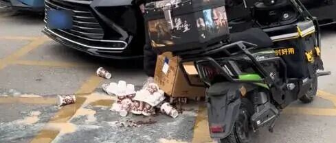 视频里,装奶茶的纸箱倒在地上,多杯奶茶从纸箱中摔出,液体混着珍珠、椰果洒了一地,外卖小哥显得无奈又沮丧。“我听到他打电话给顾客,告知顾客刚才人多不小心洒了奶茶,希望可以给他一次机会,他马上返回奶茶店重新自费下单购买。”视频发布者称。