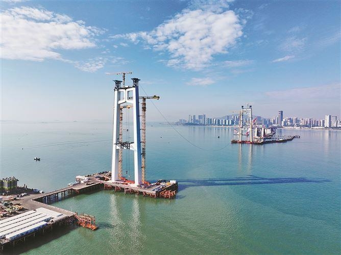 据悉,刘五店航道桥是厦金大桥厦门段的控制性工程,大桥总长1948米,采用五跨连续组合桥塔平面缆悬索桥结构,这是福建省首座全离岸式海中悬索桥。所谓“悬索桥”,简单来说就是用缆索将桥面整体“提起”的桥梁类型。
