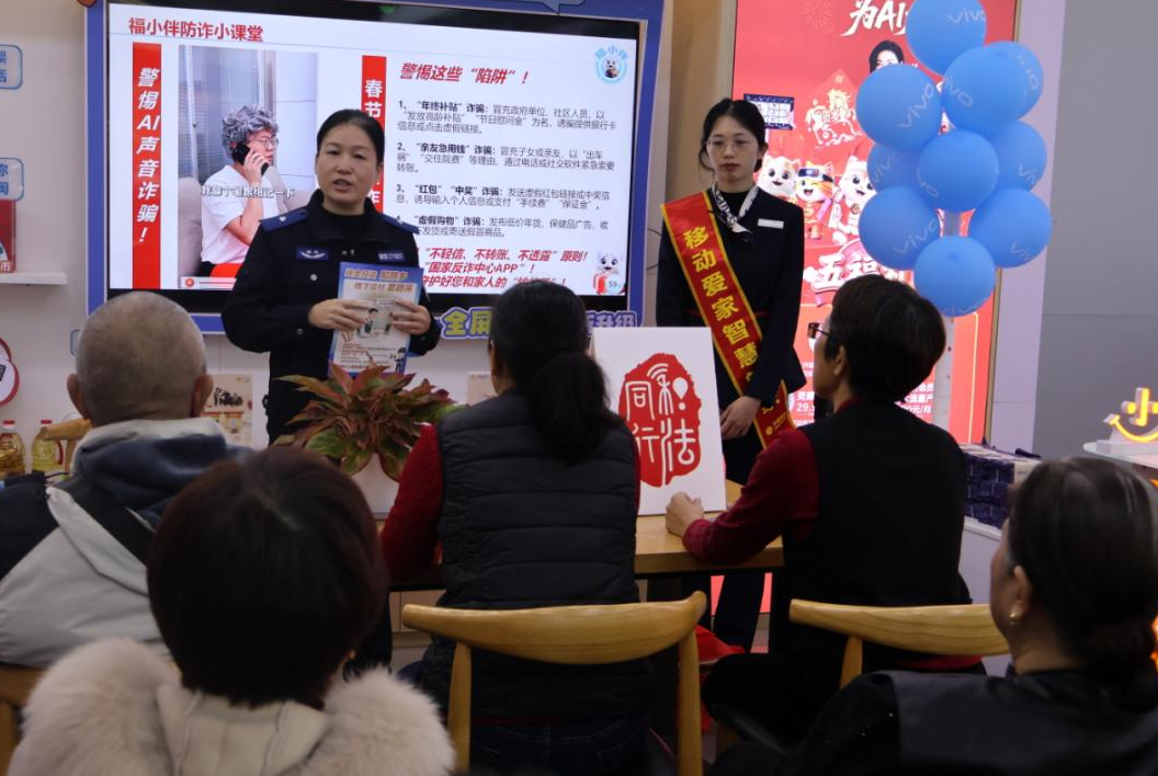 厦门移动在营业厅开设“福小伴”防诈小课堂,邀请大同派出所反诈干事为老人讲解防诈知识。