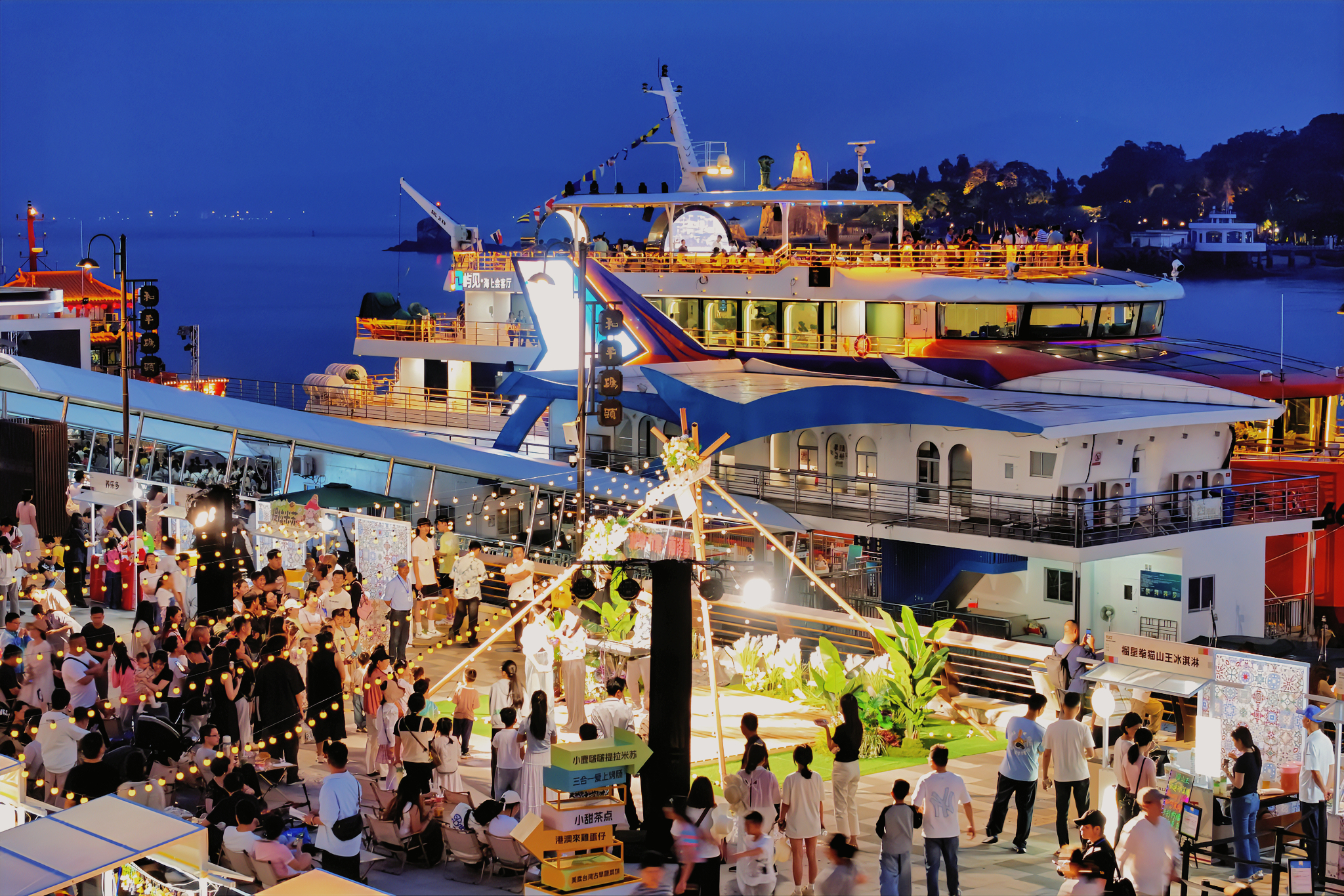 夜幕降临时,“鹭江宴”“鼓浪往风”等豪华微游轮将变身海上舞台,举办海上新春音乐会。非遗南音与流行轻音乐巧妙融合,配合“猜歌送喜”等互动游戏,让传统年味焕发新意。