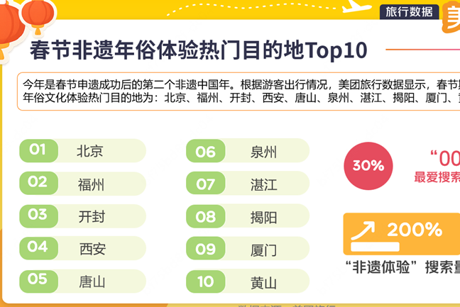 美团旅行数据显示,近一周来,“非遗体验”搜索量同比增长200%。根据游客出行情况,春节期间,美团上热门非遗年俗文化体验热门目的地Top10为:北京、福州、开封、西安、唐山、泉州、湛江、揭阳、厦门、黄山。其中,福州上榜“2026非遗年俗体验目的地Top3”