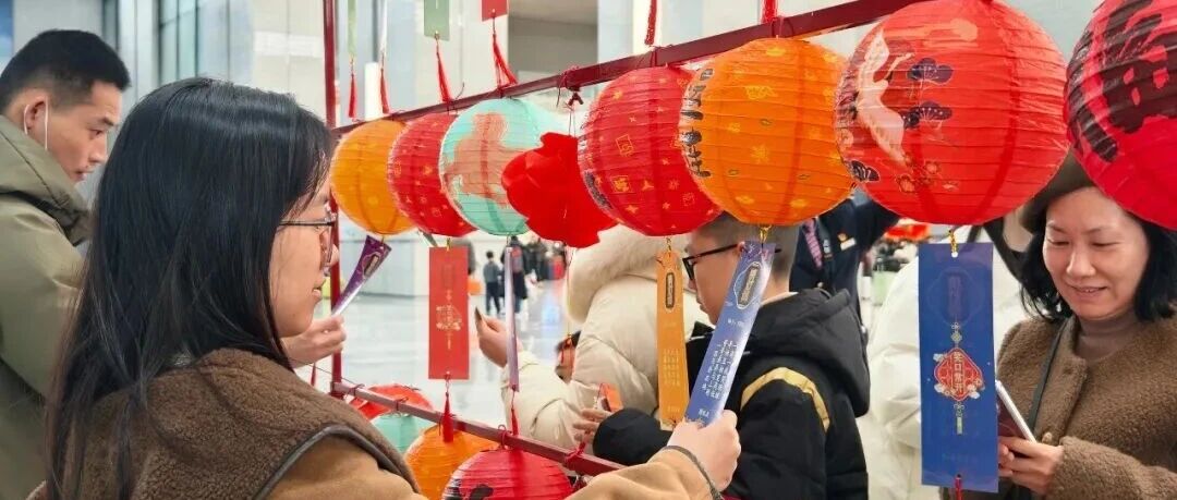 猜谜展架前热闹非凡,谜面融合马年成语、姓氏谜语与铁路知识,大家踊跃参与、互相探讨,猜对即可领取百家姓红包、春联、文创小礼品,现场欢声笑语不断。