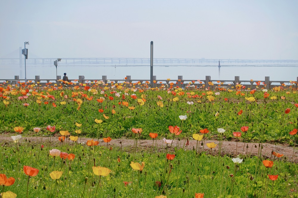 远远望去,花海与蔚蓝海岸线、大桥相映成画,一半碧海、一半繁花,如大自然打翻的调色盘,绘出一幅绚烂的油彩画。